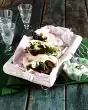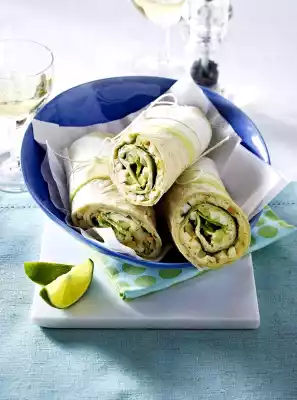 Finely chop the remaining eggs. Briefly heat the wheat cakes in the microwave or oven. Spread the wraps with cream cheese first, then cover with lettuce, eggs and cucumber sticks. Roll up the wraps, wrap them tightly in foil and chill them for about 30 minutes. Cut wraps and cucumber strips in half. Wrap 1/2 cucumber strips around 1/2 wrap
