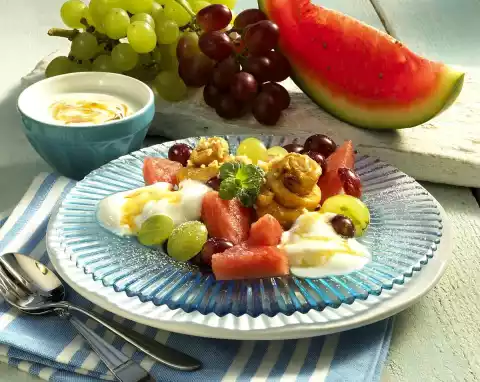 Wash and possibly halve the grapes. Cut the melon skin from the flesh, cut the flesh into pieces. Heat oil to 175 °C. Roll out dough thinly on a floured work surface (approx. 24 x 40 cm). Cut into eight 3 cm wide strips and roll up. Moisten the ends of the dough with water and press down. Add 2-3 dough snails to each hot oil and bake for 2-3 minutes. Pour the honey syrup over Xerotigana Kritis. Sprinkle with walnuts. Mix yoghurt and remaining honey. Arrange 2 Xerotigana Kritis and fruit salad on plates.