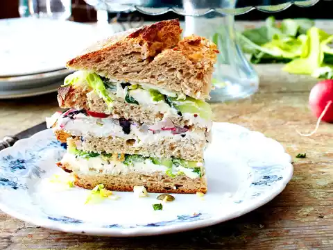 Sprinkle with salad strips. Place all the bases on top of each other and press down lightly. Place the bread lid (see tip) on top.