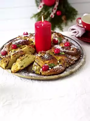 Place the jelly and pistachio mixture on top and spread it evenly with your hands. Roll up the dough from the long side. The seam edge should be at the bottom. Cut the roll lengthwise. Twist both strands of dough into a cord. Lift onto a baking tray lined with baking paper and lay the dough cord in a wreath. Press the ends well together