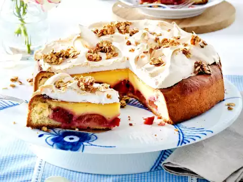 In the meantime, beat the egg whites until stiff, add 1 pinch of salt and 150 g sugar. Take the cake out of the oven, add the meringue, spread loosely, leaving the edges free. Bake in the preheated oven (electric cooker: 175 °C/ convection oven: 150 °C/ gas: see manufacturer) for another 10-15 minutes. Remove from the oven and allow to cool on a cake rack. Decorate the cake with oat flakes and arrange on a cake plate.