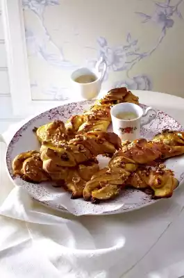 Put flour, 60 g sugar, salt, 75 g butter and 1 egg into a mixing bowl. Warm milk with saffron lukewarm, dissolve yeast in it. Pour into the bowl and knead to a smooth dough using the dough hooks of the hand mixer. Cover and leave to rise in a warm place for about 45 minutes