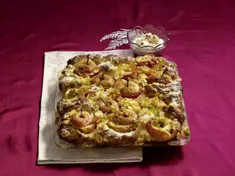 Knead the dough, half of the fruit mix and marzipan again. Form 18 balls and place them on a buttered baking tray (24 x 30 cm; measured inside). Press the apples evenly distributed into the dough, let them rise again for about 20 minutes. Press 50 g butter in small flakes into the dough. Sprinkle with 75 g sugar, remaining fruit mix and almonds. Put the lid on the apples. Bake in the preheated oven (electric cooker: 200 °C/ convection oven: 175 °C/ gas: level 3) for about 25 minutes. Serve with whipped cream sprinkled with cinnamon
