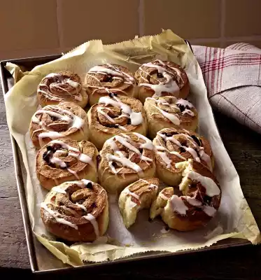 Knead the dough on a floured work surface. Roll out to a rectangle (25 x 30 cm). Spread with half of the remaining butter, leaving a narrow strip on one long side. Mix 2 tbsp. sugar and cinnamon and sprinkle on the dough. Spread soaked sultanas on top. Moisten the released strip with water. Roll up the dough from the other side. Press the moist end down well. Coat the roll of dough with the remaining butter and cut into 12 slices