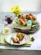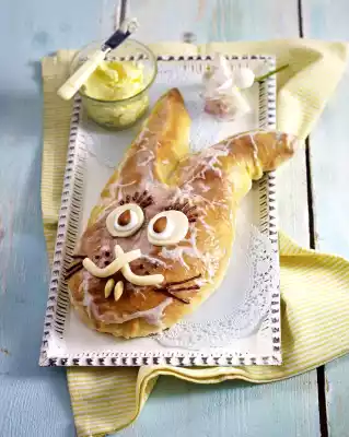 Knead the yeast dough again briefly and cut in half. Form an approx. 25 cm long tapering cone from each half of the dough. Cut the cone from the pointed end to the middle. Press the other, thicker end slightly flat. Place the rabbit heads slightly offset on a baking tray lined with baking paper, pulling the ears slightly apart. Let the rabbit heads rise for 20-30 minutes. Mix the egg yolk and 2 tbsp. water and brush the rabbit heads with it. Bake in the preheated oven, 2nd shelf from below (electric oven: 200 °C/ convection oven: 175 °C/ gas: level 3) for about 15 minutes. Leave to cool on the baking tray