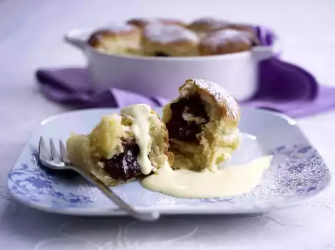 Leave to rise again for about 30 minutes. In the meantime, melt 50 g of fat for the glaze. Add 125 ml milk and 25 g sugar. Pour over the passed baked pastries. Bake in the preheated oven (electric cooker: 200 °C/ convection oven: 175 °C/ gas: level 3) for 25-30 minutes. Cover if necessary after half the baking time. Remove the pastries from the oven, dust with icing sugar and serve with vanilla sauce