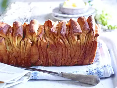 Grease the box form (approx. 1 3⁄4 l capacity; 30 cm long). Mix 150 g sugar with cinnamon. Knead the dough briefly, roll out just under 1 cm on a lightly floured work surface. Spread with 100 g butter and sprinkle with cinnamon sugar.