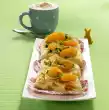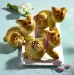 For the suns, roll up the remaining rolls slightly at the ends, then lay them on top of each other in a star shape. Whisk the egg yolk and cream and brush the dough pieces with it. Sprinkle the plaits with chopped almonds.