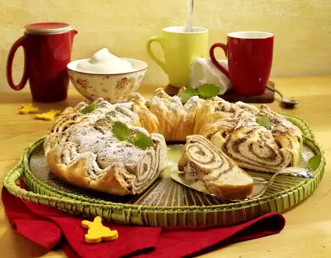 Mix yeast and 5 tablespoons of warm milk and put it into the flour bowl. Mix with flour from the edge and dust with a little flour. Cover and leave to rise in a warm place for about 15 minutes. Add 70 g fat, 1 egg and remaining milk and knead to a smooth dough with the dough hooks of the hand mixer. Cover the dough again and let it rise for about 30 minutes. Roll out the dough on a floured work surface in a rectangular shape (35 x 50 cm) and spread with the nut mixture, leaving 1 cm free at the edges. Roll the rectangle up tightly from the long side. Place the dough roll on a baking tray lined with baking paper to form a wreath and cut a zig-zag pattern into the surface with scissors. Leave to rise again for another 15 minutes. Whisk the egg yolk and cream, brush the wreath with it and bake in a preheated oven (electric range: 200 °C/ convection oven: 175 °C/ gas: level 3) for approx. 35 minutes.