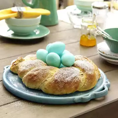 Cut the dough in half and form into strands of approx. 60 cm each with floured hands on a floured work surface. Weave the strands into a braid and lay them on a baking tray lined with baking paper to form a wreath. Whisk the egg yolk and cream and brush the wreath with it. Bake in the preheated oven (electric cooker: 200 °C/ convection oven: 175 °C/ gas: level 3) for 30-40 minutes. Let them cool down. Dust with icing sugar. If necessary, arrange on a plate in the middle with coloured Easter eggs