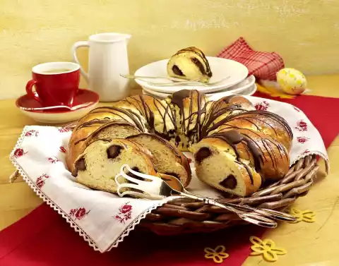 Leave to rise again for another 15 minutes. Brush the wreath with egg yolk cream. Bake in the preheated oven (electric range: 200 °C/ convection oven: 175 °C/ gas: level 3) for 35-40 minutes. Let them cool down. Roughly chop the chocolate and melt in a bowl over a warm water bath. Spread the chocolate with a spoon over the wreath and chill for approx. 30 minutes