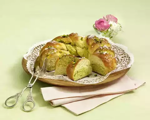 Cover and leave to rise in a warm place for about 15 minutes. Add fat, egg and remaining milk and knead to a smooth dough with the dough hooks of the hand mixer. Cover the dough again and let it rise for about 30 minutes. Finely crush 3 tablespoons of pistachios in the universal chopper. Halve the dough and knead the pistachios under one half. Form both halves of the dough into strands of approx. 45 cm each. Turn the strands into a cord and fold them into a wreath on a baking tray lined with baking paper. Leave to rise again for another 15 minutes. Bake in the preheated oven (electric cooker: 200 °C/ convection oven: 175 °C/ gas: level 3) for 35-40 minutes. Let the wreath cool down on a cake rack.