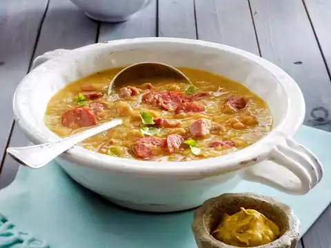 Remove the cured pork and sausages from the soup. Remove meat from the bone and dice, cut sausages into slices. Put meat and sausage back into the soup. Season to taste with salt and pepper. Sprinkle with marjoram leaves.
