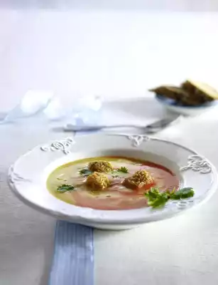 Pour soup through a sieve, bring to the boil again, season with salt, pepper, sugar and Worcester sauce. Pour both into smaller litre measures and at the same time run against each other in soup plates.