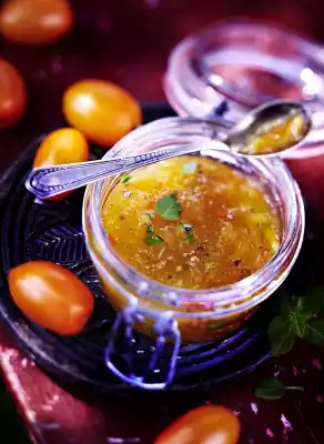 Bring everything to the boil and let it boil for about 4 minutes while stirring constantly. Wash the basil, shake dry, pluck leaves from the stems, chop coarsely and stir into the jam about 1 minute before the end of the cooking time. Pour the jam immediately into clean glasses and close them tightly. Place the jars on the lid for approx. 5 minutes, turn them over and let them cool down