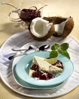 Turn over ice, remove foil. Cut off required slices of ice (refreeze the rest). Serve with cherries and the rest of the coconut flakes