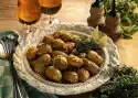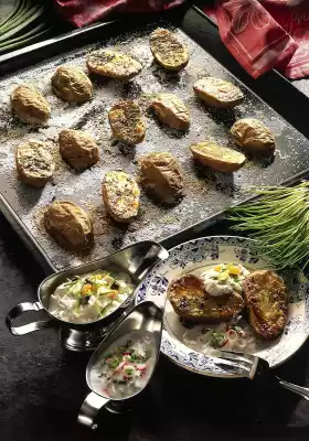Wash the potatoes thoroughly and cut in half lengthwise. Sprinkle a baking tray with salt and herbs. Put the potatoes with the cut surface on the baking tray. Bake in the preheated oven (electric cooker: 200 °C/ gas: level 3) for 45-50 minutes. In the meantime, clean and wash the radishes and spring onions. Cut spring onions into thin rings, radishes into fine sticks.
