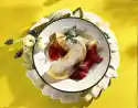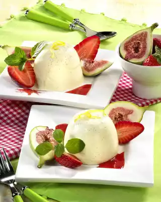 Washing fruit. Clean the strawberries, if necessary puree half with lemon juice and 1 tablespoon sugar. Cut the rest of the fruit into pieces. Turn out the cream and arrange everything