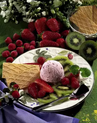 Let the ice cream thaw a little. Arrange marinated fruits on plates. Form balls from the ice cream and place them on the fruits. Serve garnished with lemon balm. Delicious with waffles