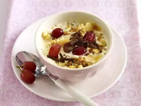 Roast the almonds in a pan without fat until golden brown, take them out and let them cool down. Wash the grapes, halve them according to size. Chop the chocolate. Mix muesli, grapes and yoghurt, fill into a bowl.