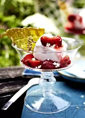 Take out ice, cut into cubes. Break the caramel into pieces. Arrange ice cream with strawberries and caramel.