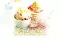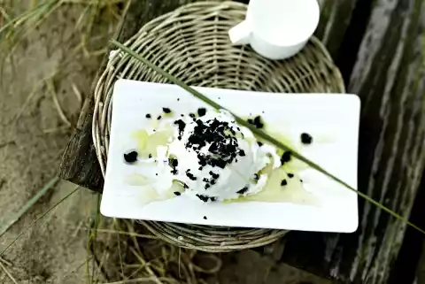 Cut out balls from the yoghurt ice cream and arrange on plates. Sprinkle with the dried sweet olives. Drizzle olive oil and remaining honey over them.