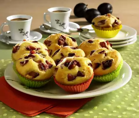 Fold in plums. Place 2 paper cuffs in each well of a muffin tin (12 wells). Fill in the dough. Bake in a preheated oven (electric range: 175 °C/ convection oven: 150 °C/ gas: level 2) for 25-30 minutes until golden brown.