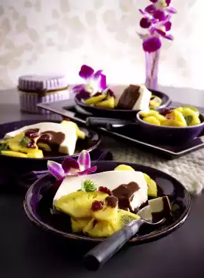 Cut the panna cotta into slices. With fruit and chocolate sauce.