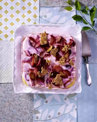 Mix yoghurt, lemon juice and 2/3 of the compote. Place the edge of the springform pan around the bottom again. Pour yoghurt cream onto the sponge cake base. Spread the rest of the plum compote on top. Chill the cake for at least 4 hours