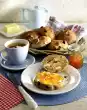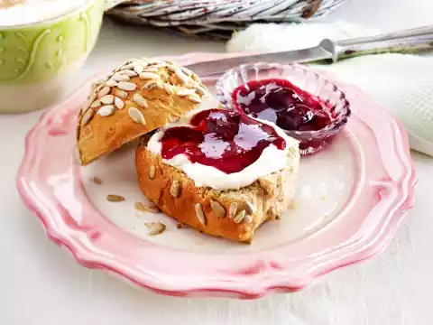 Bake in the preheated oven (electric cooker: 200 °C/ convection oven: 175 °C/ gas: level 3) for approx. 25 minutes. Remove the rolls, let them cool down for about 10 minutes and remove from the edge. Let them cool down on a cake rack. Serve with quark and cherry jam.