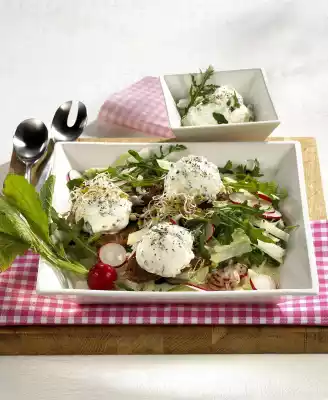 Heat the fat. Fry slices of bread in it until golden brown. Mix radishes, remaining rocket, kohlrabi and sprouts with the marinade. Arrange salad on plates. Cut 8 balls from the yoghurt mixture with an ice-cream scoop or 2 tablespoons and place them on the bread slices. Arrange the slices of bread on the salad. Garnish with radishes