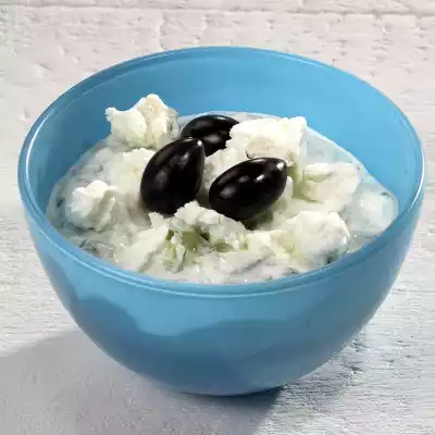 Season with salt and pepper. Arrange yoghurt and sheep's cheese dip in small bowls and garnish with black olives.