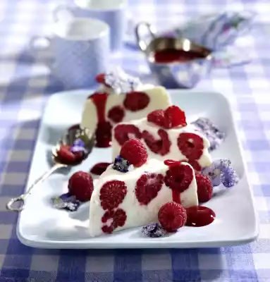 Stir in 4 tablespoons of yoghurt cream, then stir into the remaining cream. Chill the cream for about 10 minutes until it starts to gel. Whip the cream until stiff and fold into the cream. Finally, carefully fold in 125 g raspberries. Rinse 2 ramekins/timals (approx. 175 ml each) with cold water, then add the cream. Chill the timbale for at least 4 hours. In the meantime, put 2 tablespoons of sugar on a flat plate. Brush the flowers with egg white and turn in the sugar. Leave the flowers to dry on the sugar for 4-5 hours. Puree 150 g raspberries and icing sugar and pass through a sieve.