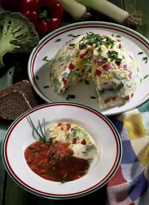 Fold the prepared vegetables into the yoghurt mixture and pour everything into a round mould (1.5 litres capacity) rinsed with cold water. Leave to set in the refrigerator for 4 hours. For the sauce, puree chunky tomatoes with the cutting stick of the hand mixer.