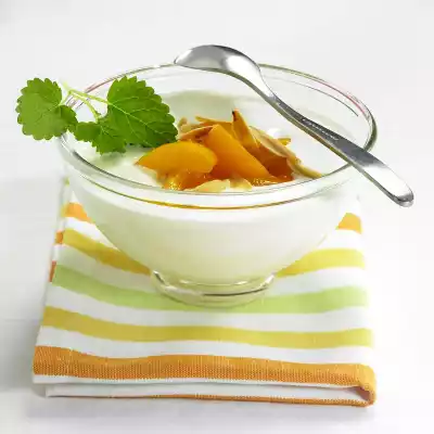Roast the almonds in a pan without fat until golden brown. Mix yoghurt, sugar and lemon juice and pour into a bowl. Use 3 apricot halves, the rest for other purposes, cut into slices and add.