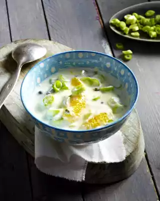 Mix yoghurt, spring onions, green pepper and orange filets, season with salt, pepper and orange juice.