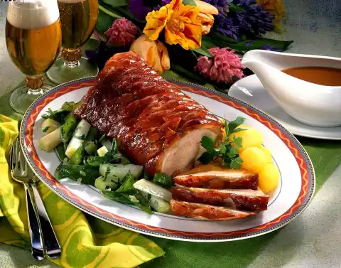 Coat the rind with salted water approx. 20 minutes before the end of the frying time and fry at 200 °C (fan oven: 175 °C/gas: level 3) until crispy
