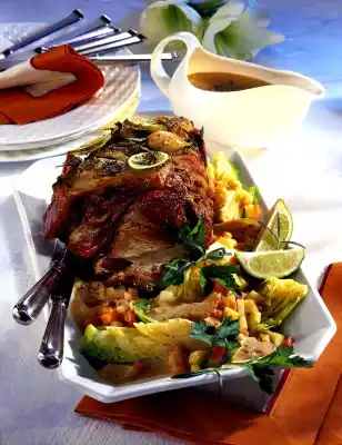 Wash lime hot and cut into slices. Mix garlic, rosemary, lime, wine, 3/4 litre water and 1 level teaspoon of salt. Peel and halve the shallots. After 1 1/2 hours spread on the fat pan. Pour the marinade on the roast about 40 minutes before the end of the frying time. After another 20 minutes pour on the rest of the marinade. Peel, wash and finely dice potatoes and carrots. Clean the pointed cabbage, cut into quarters and cut out the stalk. Cut into pieces.