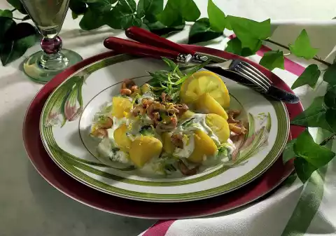 Scrub the potatoes, wash them thoroughly, cut them in half and cook them in little boiling salted water for about 20 minutes. In the meantime wash the cucumbers and grate them into the quark. Peel and chop the onions.