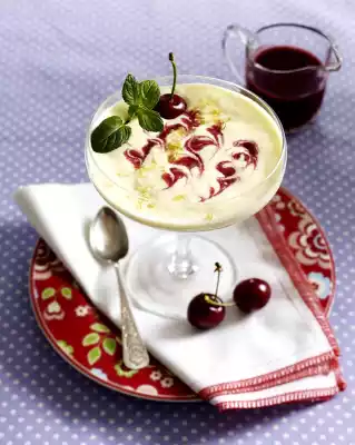 Whip the cream until stiff and carefully fold into the wine cream. Finely chop the almond brittle. Fill cream into bowls, marble with cherry sauce and sprinkle with almond brittle. Decorate with cherries and mint.