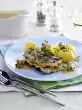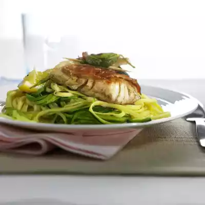 Heat 2 tablespoons of olive oil. Fry the fish pieces on each side for 3-4 minutes. In the meantime, heat 2 tablespoons of oil in a second pan. Fry the garlic and zucchini for 2-3 minutes at medium heat.