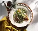Season with salt, pepper and chopped sage. Add the drained pasta and toss with the vegetables. Serve garnished with lemon.