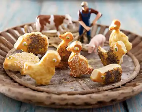 ##Beat the egg yolks and 1 tablespoon of water. Brush the animals with it and sprinkle with sesame, poppy seed and the rest of the cheese. Bake in the oven for 10-12 minutes one after the other. Let it cool down.