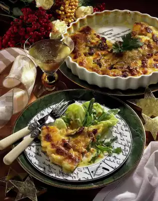 Cut the tomatoes into strips. Peel and finely chop the onions. Mix half of the onions and tomato strips with cream, season with salt and pepper. Pour over the gratin. Grate the cheese and sprinkle over the gratin.