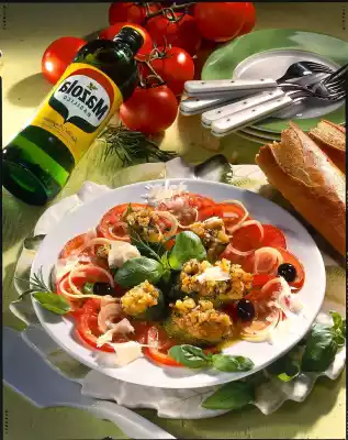Bake in a preheated oven (electric cooker: 200 °C/ gas: level 3) for 12-15 minutes. In the meantime, clean, wash and slice the tomatoes. Peel onion and cut into rings. Mix remaining oil and vinegar and season with salt and pepper. Arrange tomatoes and onions on a plate and pour the vinaigrette over them. Arrange the zucchini au gratin and serve garnished with olives, basil, rosemary and parmesan slices.