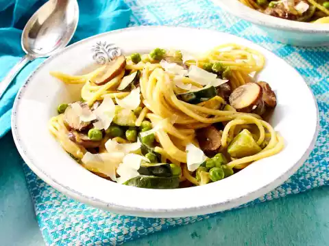 Add cream, bring to the boil and place spaghetti in the cream. Pour 500 ml of boiling water over it. Add broth and bring to the boil. Mix spaghetti with the vegetables.