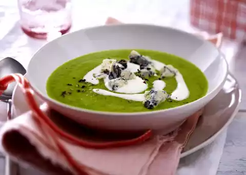 Whip the cream until semi-stiff. Puree the soup with a hand blender. Stir in half the cream and season with salt, pepper and 1 pinch of sugar. Crumble the gorgonzola roughly. Serve the soup with the remaining cream and gorgonzola.