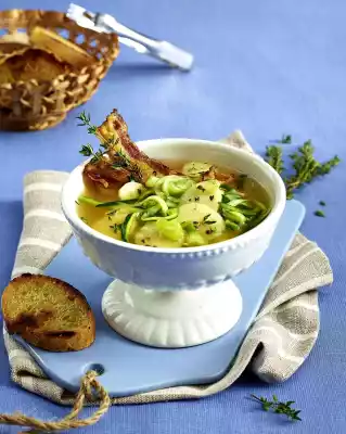 Wash thyme and shake dry and, except for 4 stems for garnishing, strip leaves from the stems. Add the onions, thyme leaves and zucchini to the soup about 3 minutes before the end of the cooking time. Season to taste with salt.