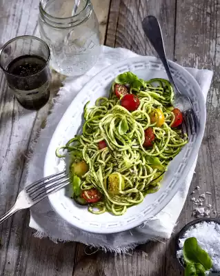 Wash and clean the zucchini and cut them into long strips with a spiral slicer. Wash and halve the tomatoes. Mix the zucchini noodles and pesto carefully and season again. Mix in tomato halves and arrange on a plate.