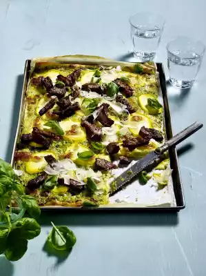 Spread the dough with wild garlic sour cream and spread the zucchini on top. Add the mozzarella. Bake in the preheated oven (electric cooker: 225 °C/ convection oven: 200 °C/ gas: see manufacturer) for 18-20 minutes.